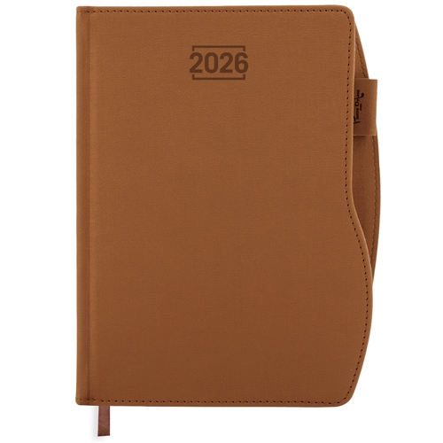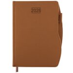 Inclui porta-esferográfica e dietário dia/pagina da cor creme.