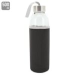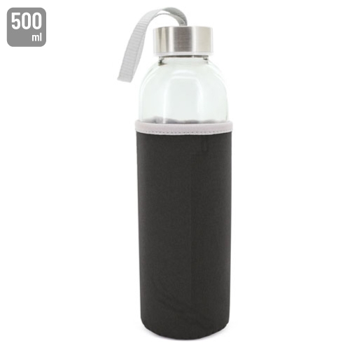 Botella de agua realizada en cristal. Su funda de neopreno antideslizante y desmontable ofrece protección y decoración además de un efecto de aislamiento para la botella. Puedes llevarla donde quieras con su cómoda asa incorporada. Disponible en una gran variedad de colores, y en original GRIS VIGORE. Capacidad de 500 ml. Cada botella presentada en una caja.