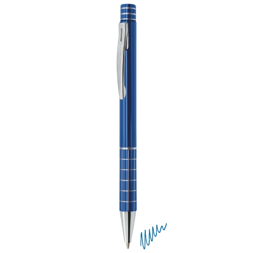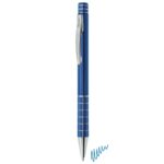 Bolígrafo metálico de escritura azul.Cuerpo de colores eléctricos con líneas de color metal.Incluye funda de antelina.