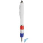 Bolígrafo antiestrés giratorio con detalle bandera españa, francia e Italia. Escritura azul
