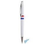 Bolígrafo con sistema giratorio y detalle de bandera en el cuerpo.Escritura azulCada pieza en bolsa individual.