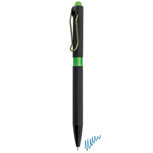 Bolígrafo realizado en textura soft effect, cuerpo de bolígrafo de goma negra, clip metálico y goma touch en color.Técnica de grabación de el bolígrafo Shiny en láser fibra con acabado brilloespejo a juego con el color del touchEscritura azulDisponible en una amplia variedad de colores