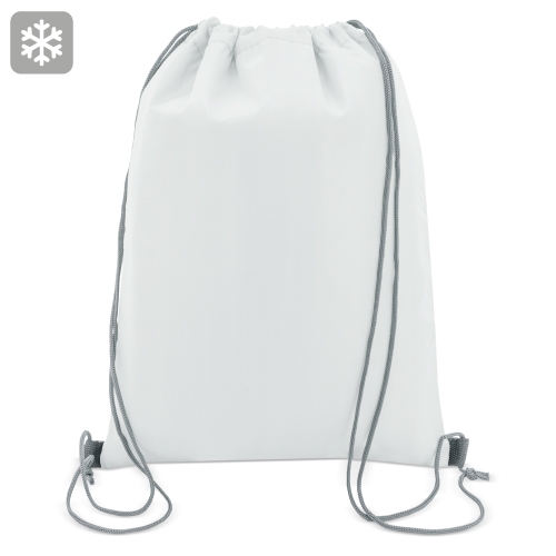 Prática bolsa-mochila com alças de corda em poliester em cores vivas no exterior. Interior forrado com material de isolamento térmico de alumínio. Perfeito para levar bebidas frias ou lanches em suas caminhadas. Disponível em tamanho padrão para adultos (G-078) e em tamanho especial para crianças (G-079).