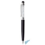 Original e elegante caneta com sistema rotativo, decorada com cristais strass no interior. Inclui toque para usar com seu celular ou tablet. Escrita azul.