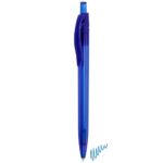 Caneta transparente disponivel numa amplia variedade de cores, escrita azul.