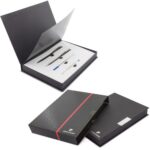 Descubre la elegancia y distinción que caracterizan a la marca Pierre Cardin en este exclusivo estuche homenaje inspirado en un libro compuesto por 4 piezas. Al abrirlo, descubrimos en la primera hoja una cita junto a la imagen de Pierre Cardin. En su interior encontramos un bolígrafo, un roller y recambios de tinta para ambos. El bolígrafo, con sistema de giro y el roller presentan un diseño facetado en color granate en el cuerpo, y un acabado metálico en color plomo en los apliques y la tapa. Escritura Azul.