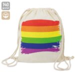 Bolsa mochila realizada em algodao com o arcoíris impresso por uma cara, ficando a outra livre para colocar qualquer gravaçao.