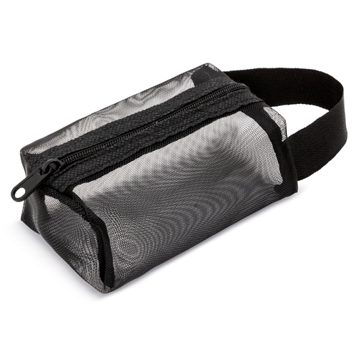 Necessaire de viagem em malha semitransparente, perfeita para transportar e ocupar pouco espaço.