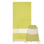 Cómoda bolsa que se converte numa grande toalha, suave e realizada em algodão reciclado e orgánico.Uma vez usada, podes voltar a dobrar-la e utilizar-la como bolsa