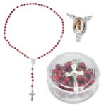El clásico rosario con cuentas de madera y cruz con relieve. Desprende un agradable aroma a pétalos de rosa.Incluye cajita de presentación transparente.Cada pieza en bolsa individual