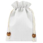 Saco para presente com fechamento em cordão.As cordas incluem um detalhe de madeira em forma de bolaDisponível em uma ampla variedade de cores