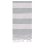 Descubra nossa nova coleção de toalhas pareo, com uma ampla variedade de cores que permitirão que você se adapte à sua imagem corporativa. Imagine o logotipo da sua empresa espalhado na areia de uma praia paradisíaca ou em uma piscina de luxo. A toalha felpuda “Cala Bonita” (T-269) é feita de 100% algodão por fora, com um design listrado disponível em cinza e vermelho-azul. Seu interior apresenta uma toalha felpuda, 100% poliéster. O acabamento com franjas trançadas nas extremidades confere um toque original e moderno.